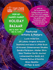 Mark your calendars and be sure to visit OPAL’s maker’s pop-up, a weekend-long holiday market at the Oak Park Art League featuring local makers selling their creations in our gallery.  We’ll have a baked goods sale to benefit OPAL and hot cocoa and warm beverages for all.